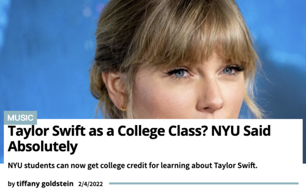 “I’ve been covering Taylor Swift since I started my writing career more than ten years ago and am of course a huge fan of her. It’s an honor to share my expertise with a wonderful group of NYU students. I hope This helps students rethink how to deal with one of the greatest and sometimes controversial stars in the world.”